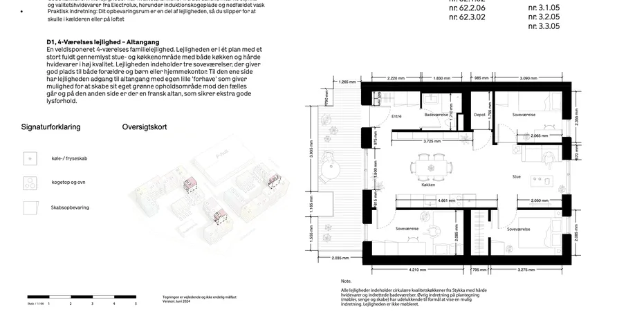 Specifikationer. Adresseregistrering mulig. 1. sal. 1 badeværelse. 4 værelser. En veldisponeret 4- værelses familielejlighed.. Lejligheden er i ét plan med et stort stue- og køkkenområde med hårde hvidevarer i høj kvalitet.. Lejligheden indeholder 3 soveværelser.. Til den ene side har lejligheden adgang til altangang med egen lille 'forhave' og den anden side, hvor der forefinde en fransk altan, som sikrer gode lysforhold.. A well-disposed 4-room family apartment.. The apartment is on one level. Indlæs mere. Beskrivelse af bygningen. 6 etager. står klar til indflytning i 1. maj 2025. Det er en nytænkende boligbebyggelse, som er udført i træ, skiffer og andre naturlige og sunde materialer. Bygningen er bygget med et ambitiøst lavt klimaaftryk, som faktisk er Danmarks lavest til dato for etagebyggeri. Udeområderne er indrettede med fokus på biodiversitet, kontakt til Nærhedens udearealer og natur, og at skabe. Indlæs mere