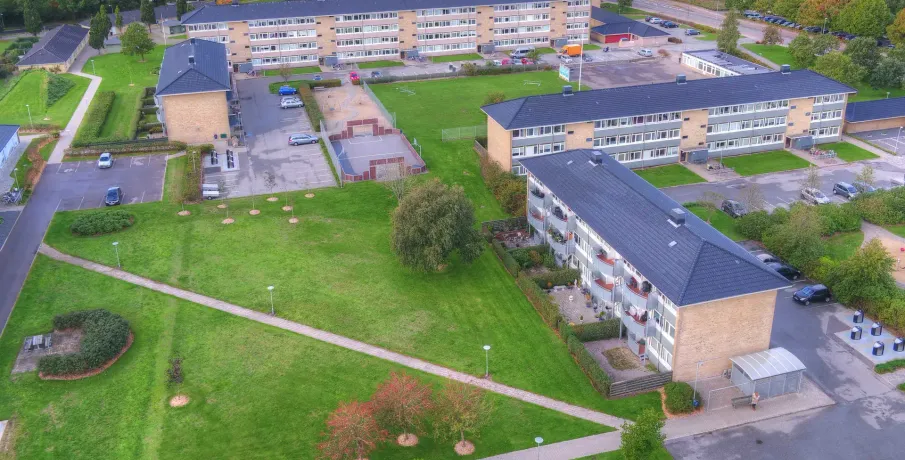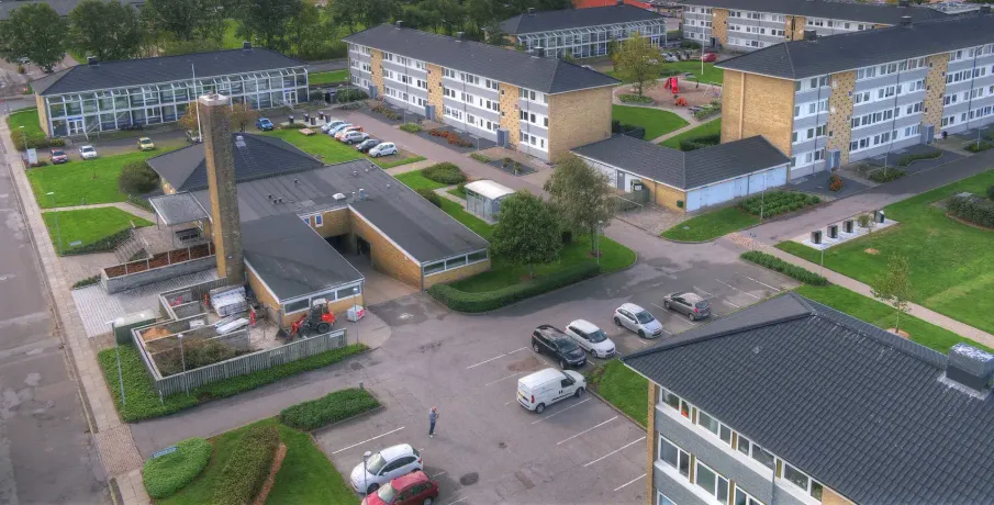 Bebyggelsen er beliggende i den sydvestlige bydel med gode forbindelser til byens ringveje, tæt på centrum og indkløb. Bebyggelsen, der består af 14 boligblokke i 3 eller 4 etager, er opført i 1960'erne og er løbende renoveret med ny stor åben altan, nyt tag, nye vinduer og døre, ligesom adskillige lejligheder har fået nye køkkener og/eller badeværelser, nye gulve, nye indvendige døre samt garderobeskabe. Der er opført særskilte bygninger, hvori der er indrettet fællesvaskeri, fælleshus samt garageanlæg. Der er fælles cykelrum, knallertrum og barnevognsrum. Til hver lejlighed hører eget pulterrum. Til hovedparten af stuelejligheder er der have - ellers er der mulighed for anlæggelse af dette. Hver bolig er tilsluttet fiberbredbånd, hvor der kan indgås aftale om tv, internet m.v. direkte med forskellige udbydere. Som en anden valgmulighed har boligerne eget antenneanlæg, hvor YouSee tilbyder deres tv-pakker og internet. 6 gange årligt foretages udvendig vinduesvask af samtlige boliger, ligesom der løbende udføres trappevask. Alle boliger har dørtelefon. Der er ladestander til elbiler på P-pladsen ved Kirke Allé 46-48. Der er store grønne områder med borde og bænke samt gode legepladser og multibane. Boligforeningen råder over 3 gæsteværelser andre steder i Skive by som kan lejes af alle beboere.
