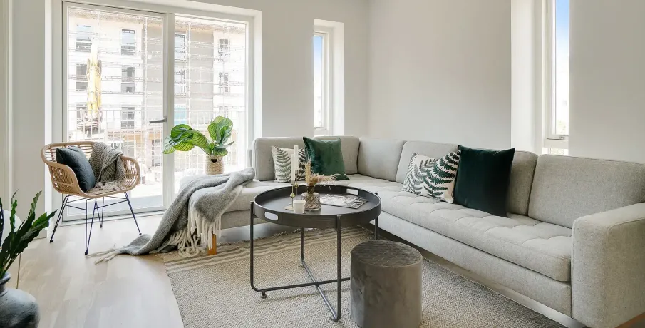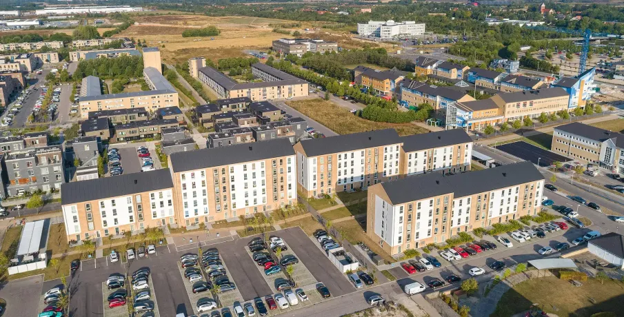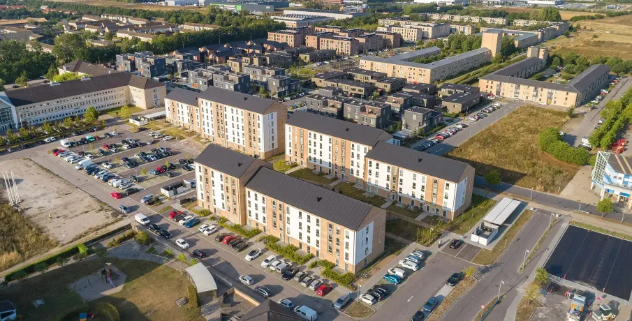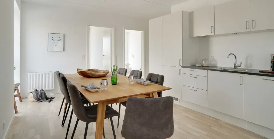 . Lejlighederne varierer i størrelse fra 1 til 5 værelser fordelt på mellem 43 og 111 kvm. Alle lejemål har en entré, et stort køkken-alrum med åben forbindelse til stue, et badeværelse og et eller flere separate værelser.. Alle lejligheder har egen altan eller terrasse.. Hårde hvidevarer. Der er alt i hårde hvidevarer inklusive kombineret vaskemaskine og tørretumbler samt opvaskemaskine.. Husdyr. Lejere kan ansøge om tilladelse til at holde én indekat på adressen. Udekatte og hund er ikke tilladt. Se vores samlede husdyrsregler. her. .. Parkering. Der er 145 parkeringspladser til fri afbenyttelse af lejerne.. Elevator. Der er elevator i ejendommen.. Fællesarealer. Mellem bygningerne er der anlagt grønne fællesarealer med beplantning, som giver mulighed for spil, leg, picnic og solbadning. Der er en legeplads til glæde for de mindste beboere.. Læs mere om boligen. De viste billeder kan være fra et andet men tilsvarende lejemål i samme ejendom. Mindre afvigelser kan derfor forekomme..