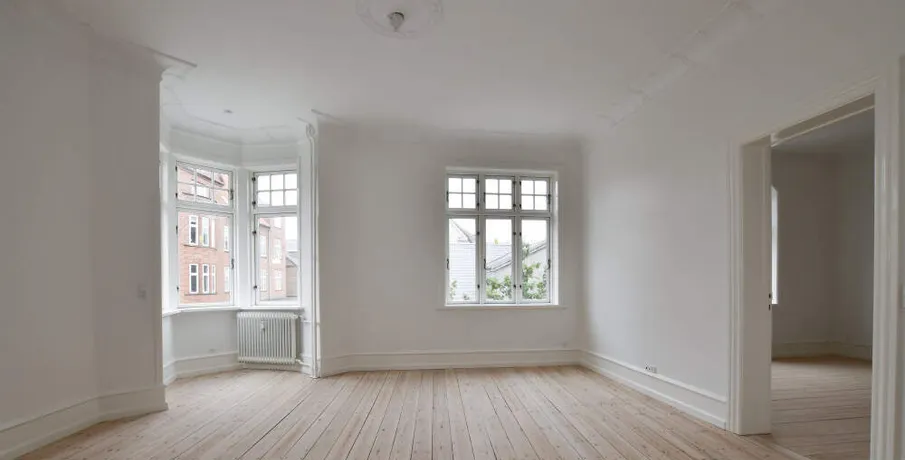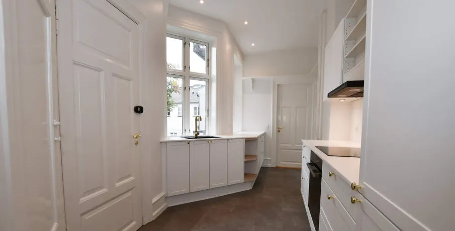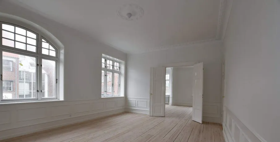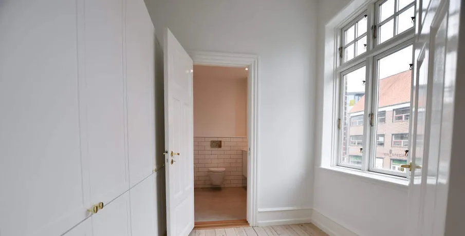 Denne flotte og velindrettede 5-værelses lejlighed ligger på 1. sal i én af Esbjergs flotteste ejendomme; "West-End" på hjørnet af og Stormgade.. Indgang til lejligheden sker fra via en flot og lys trappeopgang med flere fine snedkerdetaljer.. Lejligheden er indrettet med en entré, hvor der er adgang til et charmerende mindre toilet.. Køkkenet fra 2022 er stort og rummeligt og i tro med ejendommens stil.. Når du træder ind i de to herskabsstuer bliver du mødt med flotte paneler og stuklofter, som netop kendetegner en herskabslejlighed.. Fra soveværelset er der adgang til en fin altan med udsigt mod ejendommens gårdmiljø.. Herudover forefindes endnu to værelser med indbyggede skabsvægge, samt 1 større badeværelse, hvor der er etableret vaskesøjle med vaskemaskine og tørretumbler.. Alle opholdsrum i lejligheden har hvidmalede vægge, afhøvlede trægulve, fine fyldningsdøre m.v., ligesom der i køkkenet er installeret alt i hårde hvidevarer, herunder opvaskemaskine.. Kælderrum forefindes i ejendommen.. Mulighed for parkering i gården.. HUSDYR ER IKKE TILLADT I EJENDOMMEN!