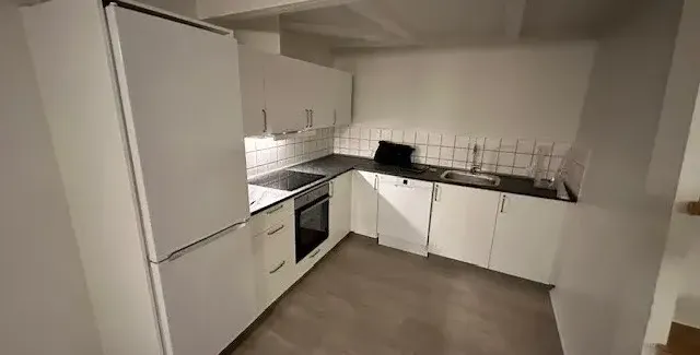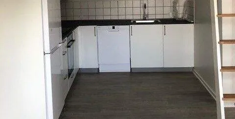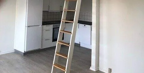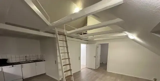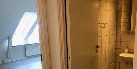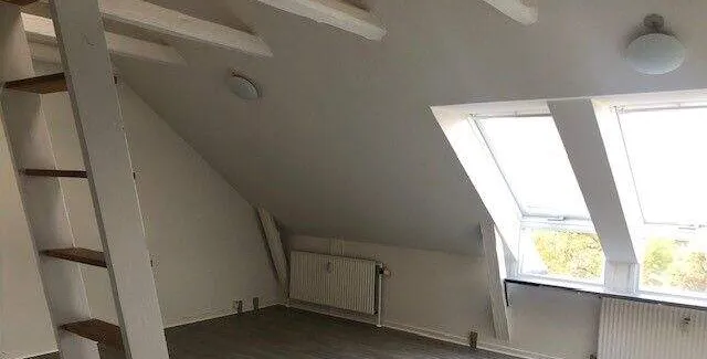 Hyggelig taglejlighed øverst oppe på 4.sal med udsigt over Odense by og Kongens Have. Der er IKKE elevator i ejendommen. . Nyt køkken i åben forbindelse til stue/opholdsrum. Der er en større hems i stuen, der kan bruges til ekstra opholdsrum, opbevaring el. lign.. Adgang til fælles gårdhave og fællesvaskeri i kælderen. Der hører et depotrum til lejemålet.