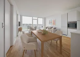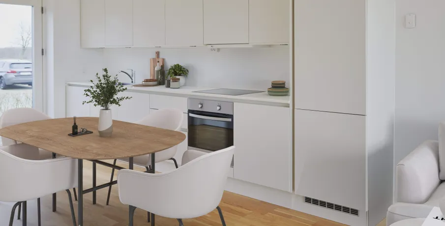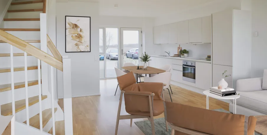 I Rodskov, tæt på Hornslet og kun 18 km nord for Aarhus, finder du dette skønne rækkehus. . Rækkehuset er i to plan og indeholder: . • Entré med plads til overtøj og sko. • Stort køkken-alrum i åben forbindelse med stuen. • To badeværelser. Et i stueplan og et på førstesal. • Tre store lyse værelser med store vinduespartier. Stue, køkken og gæstetoilet er beliggende i stueplan mens de tre værelser samt husets andet badeværelse forefindes på 1. sal. . I køkkenet er der alt i hårde hvidevarer og på badeværelset i stueplan finder du husets vaskemaskine og tørretumbler. . Overalt i boligen er der gulvvarme.. Stilen er gennemført fra start til slut med den nordiske minimalisme som omdrejningspunkt og det skønneste lysindfald i alle rum. . Udenfor er der forhave med depotskur, og fra stuen er der direkte udgang til en dejlig terrasse. . Ejendommen byder derudover på følgende faciliteter: . • Mulighed for at holde husdyr. • Eget skur til opbevaring . • Grønne fællesområder og legeplads. • Gratis parkering. Med adresse i Kaløvigparken bor du side om side med alle former for natur – strand, skov og grønne marker – samtidig med, at du kun er en kort køretur fra byen. Der er 20 minutters kørsel til Aarhus C og kun få minutter til Hornslet med indkøbsmuligheder, skole- og pasningstilbud samt letbane. . Indflytningspris: 2 måneders depositum og 0 kr. i forudbetalt leje. . Forbrug aflæses af lejer og er ikke inkl. i huslejen.. For at blive godkendt som lejer må du ikke være registreret i RKI.. Lyder det som noget for dig? Så kontakt os allerede i dag for en fremvisning. . Husk også at undersøge om du kan få boligstøtte (boligsikring). Du kan se, om du er berettiget til boligstøtte hos Udbetaling Danmark..