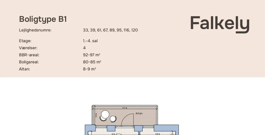 . Falkely er et godt sted at lande. Her opføres 132 moderne lejeboliger på Industrivangen i Ishøj – omgivet af grønne omgivelser og med kort afstand til både indkøb, kultur, legepladser og offentlig transport. På bare 18 minutter kan du være i København, mens du derhjemme nyder roen tæt på strand og natur.. Lejlighederne rummer 2-4 værelser med gennemtænkt indretning, køkken-alrum, moderne badeværelse med vaskesøjle og egen altan. Her er plads til både hverdag og samvær, og samtidig frihed til at slippe bekymringer om renovering eller havearbejde.. Du får adgang til fælles gårdhaver med legezoner og plantebede samt tagterrasser med udsigt over de grønne sedumtage og nærliggende natur. Ejendommene er udstyret med elevatorer og parkering, så hverdagen bliver enkel og bekvem.. Indflytning fra februar 2026. Lejepriser fra 10.200 kr./md.. OBS: Billeder er visualiseringer og afspejler ikke den specifikke bolig.