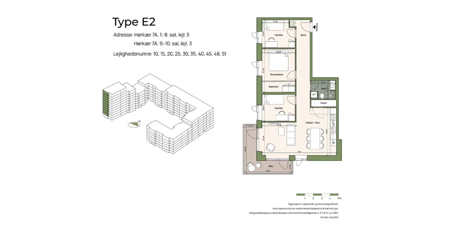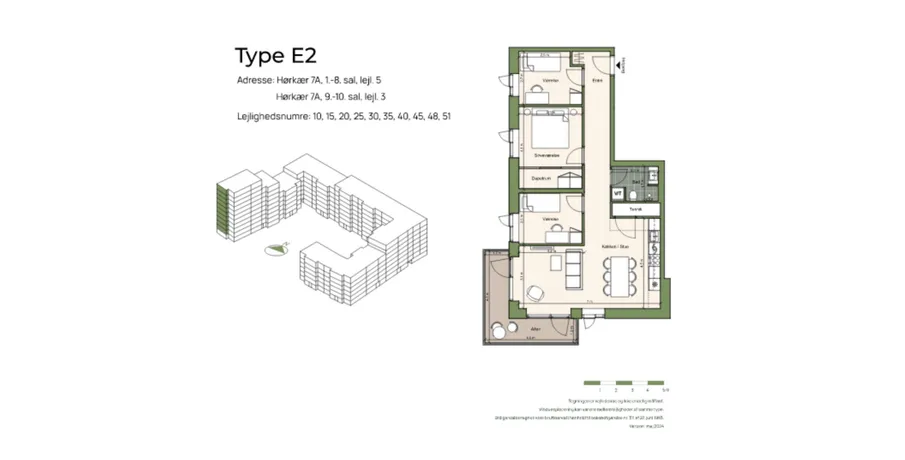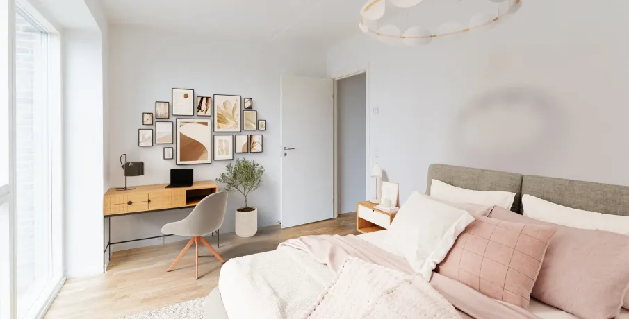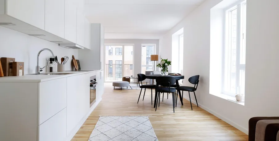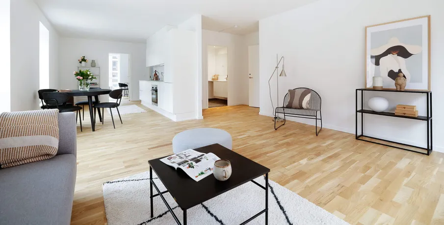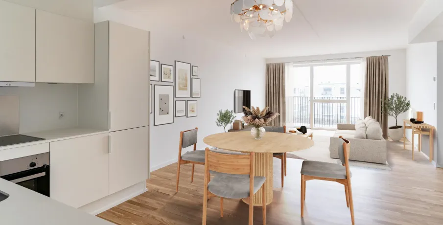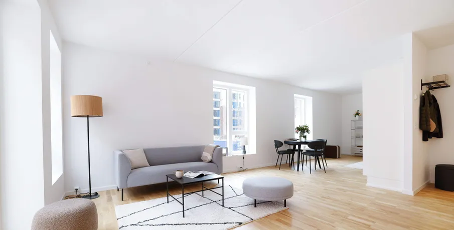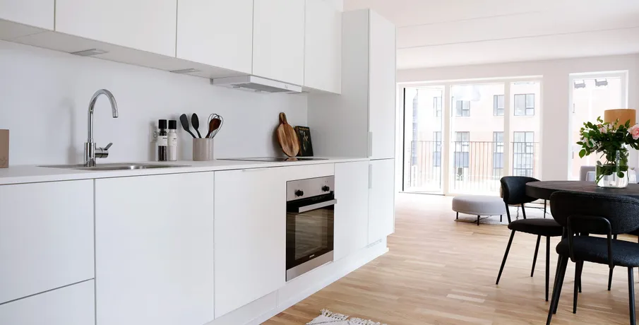 Indretning: Du bliver mødt af en indbydende og rolig atmosfære, der går igennem hele boligen. Lejligheden er en rummelig 4-værelses optimeret med en god planløsning, store vinduespartier der giver et dejligt lysindfald, samt gulvvarme. Boligen byder først på fin entré hvor her er plads til at hænge overtøjet og stille skoene. Man træder herefter videre ind i det store åbne køkken-alrum, hvor det smukke hvide Svane køkken, står i god kontrast til de varme egetræsparketgulve. Køkkenet har alt i hårde hvidevarer, kogeplade, køle-/fryseskab, indbygningsovn og opvaskemaskine. Køkken-alrummet kan fint indrettes med spiseafdeling i forlængelse af køkkenet samt et hyggeligt stueområde, hvor man kan slappe af i sofaen. Fra alrummet har man udgang til en dejlig stor altan ud mod gården, hvor udelivet og solen kan nydes med et glas koldt at drikke. Soveværelset har en god størrelse, så der er fin plads til både seng og opbevaring. I forlængelse af soveværelset ligger lejlighedens depotrum, med indbyggede skabe og ekstra plads til opbevaring. De to ekstra værelser varierer i størrelse, og der er både mulighed for at benytte lejligheden som delebolig, eller anvende de ekstra værelser til kontor eller børneværelse. Badeværelset med separate bruseniche, er beklædt med flotte store grå fliser, og er naturligvis indrettet med vaskemaskine og tørretumbler. Bemærk venligst, at billederne kan være fra en anden bolig, hvorfor indretning, beliggenhed og udsigt kan variere. Materialevalg og kvalitet er den samme for alle boliger i ejendommen. Se plantegning for indretning af denne bolig. Ejendommen: Flot karréejendom med fantastiske rammer for et stærkt fællesskab, hvor fælleshuset, orangeriet og gårdhaven er omdrejningspunktet. Ejendommen er tegnet af C.F. Møller Architects og byder på 264 lejligheder med 2-5 værelser, således er der tænkt på både små og store behov. I gårdhaven finder du en række fællesfaciliteter, heriblandt vores charmerende fælleshus med sit tilhørende og hyggelige orangeri, som er designet til at fremme trivsel og skabe grobund for et spirende fællesskab. Der er mulighed for at få en parkeringstilladelse, som koster 400 kr. om måneden. Hørkær Have står til at blive DGNB guld-certificeret. Det er din garanti for at flytte ind i en ejendom, hvor der er tænkt på miljøet samt din sundhed og trivsel. Her er blandt andet anvendt miljøvenlige materialer, sørget for et godt indeklima og skabt gode, værdiskabende fællesfaciliteter. Området:Hørkær Have ligger centralt i Herlev, et stenkast fra Herlev bymidte og kun 13km fra Københavns Rådhusplads. Med S-togstationen, Motorring 3 og letbanen der åbner i 2025, er alle muligheder åbne. Med base i Hørkær Have er du aldrig langt fra din næste destination – mens nærmiljøet byder på alt du behøver, for at skabe en god og nem hverdag med masser af livskvalitet. Med denne beliggenhed har du alt du behøver. Hvad end du søger gode shoppemuligheder eller fordybelse i naturens ro, finder du det tæt på Hørkær Have. Her kommer du til at bo 10 minutters gang fra Herlev bymidte, som byder på både shopping, gode kulturelle oplevelser og et ugentlig grønttorv, hvor du kan forsyne dig med lækre, friske råvarer. I Herlev finder du nemt et velfortjent afbræk fra storbyens larm og kan i stedet nyde roen og den friske, grønne luft. Tag eksempelvis forbi Sømosen eller Naturcenter Kildegården, hvor børn og voksne kan nyde naturlige omgivelser og hilse på både lam og tyrekalve. Herlev har også et farverigt idrætsliv, hvor gode sportsfaciliteter prioriteres. Her kan hele familien dyrke deres foretrukne aktivitet – alt fra bold- og holdsport til kampsport, ridning eller svømning.