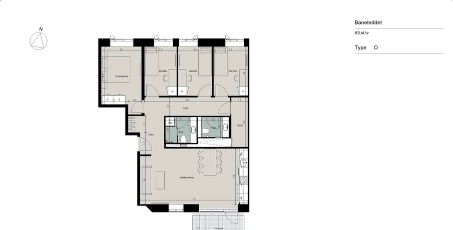 Stor 5-værelses lejlighed med god planløsning, to toiletter, gulvarme i hele boligen og egen terrasse - Ingen bindingsperiode!