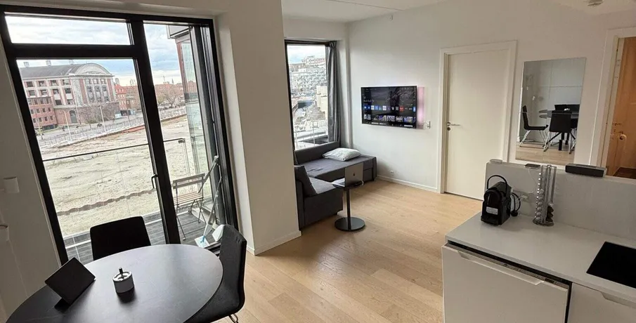 . Super flot møbleret lejlighed bestående af et åbent lækkert køkken med hvidevarer fra Miele, en stor stue med spisebord og sofagruppe med direkte udgang til en skøn altan med udsigt over havneløbet, et lækkert rummeligt badeværelse med både vaskemaskine og tørretumbler samt et rummeligt soveværelse med indbyggede skabe.. Det pulserende byliv og vandets ro går op i en højere enhed, her får du det bedste af, hvad København kan tilbyde. Der er havnebade ikke langt fra ejendommen, hvor man kan nyde en svømmetur, sommer såvel som vinter. Hyggelig kaffebar, vinbar og gode restauranter lige rundt om hjørnet og blot få minutters kørsel herfra, har man Vesterbros pulserende byliv, hvor der er rig mulighed for shopping, nyde hyggelige caféer og restauranter samt udforske det ældre København.. Tæt på Engholmene finder du Dybbølsbro Station, hvor der er adskillige S-togsforbindelser til resten af København og Metroen er lige åbnet på Engholmene og Havneholmen, så det er derfor ganske nemt at komme rundt uanset, hvilket transportmiddel man benytter sig af. Du kan også benytte dig af havnebussen som sejler 2 minutters gang fra ejendommen.. Engholmene består i dag af 6 boligøer, lejligheden er beliggende på Lyngholm. På Engholmene bliver du en del af en moderne bydel med et levende lokalmiljø og en maritim stemning med hyggelige cafeer og butikker langs kanalerne. Bebyggelsen er inspireret af klassiske Københavnske boligkarréer og opdelt i forskellige visuelle udtryk og med forskellige smukke gårdrum..