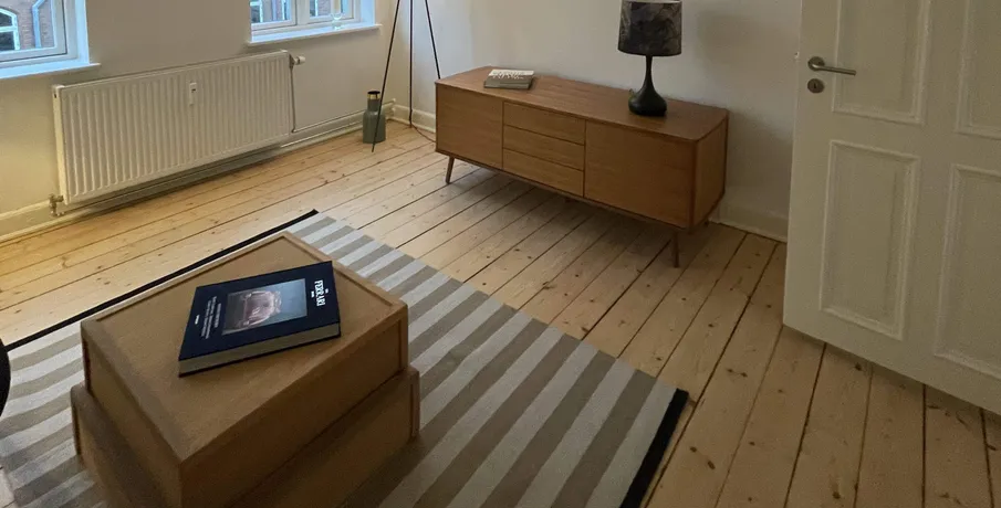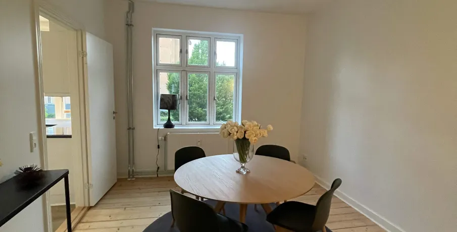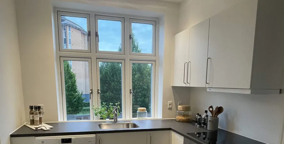 Lækker nyrenoveret høj sturelejlighed udlejes.. Billederne er fra 1 sal. Men videoen er fra lejligheden. . Indeholder lyst HTH køkken med alt i hårde hvidevarer, dvs. opvaskemaskine, ovn, induktion kogeplade, emhætte og køle/fryseskab.. I køkkenområdet er der endvidere lavet plads til vaskemaskine og tørretumbler.. Derudover er der 3 gode værelser med lækkert trægulv, hvoraf det ene er et gennemgangsværelse . Nyere rengøringsvenligt badeværelse . Der er depotrum til lejligheden, samt gode parkeringsmuligheder.. Mindre husdyr tilladt.