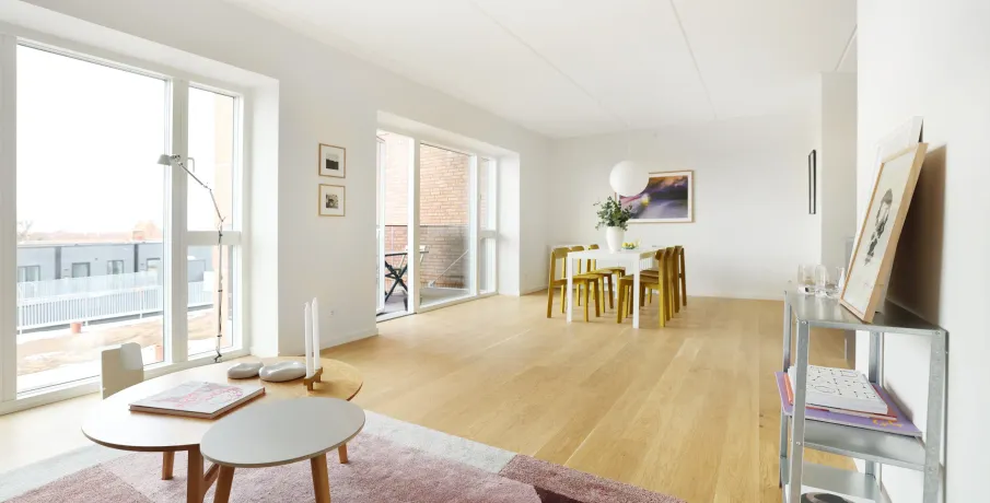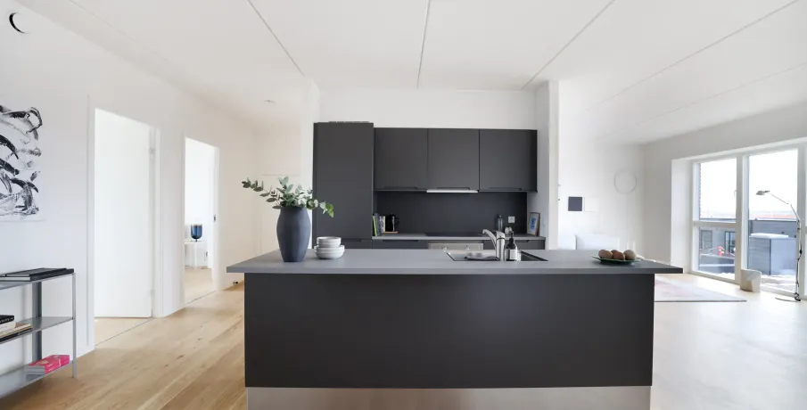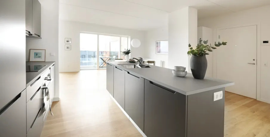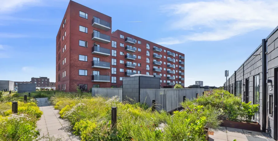 Boligen Denne store og rummelige 5-værelses lejlighed er ideel til familien eller dem, der ønsker ekstra plads. Boligen har en stor og lys stue i åben forbindelse med det moderne lava grå køkken, der er udstyret med integrerede hvidevarer. De fire værelser giver fleksible indretningsmuligheder, hvad enten du har brug for flere soveværelser, et hjemmekontor eller et multirum. Badeværelset er indrettet med bruseniche og praktiske vaskefaciliteter, og derudover har boligen et gæstetoilet for ekstra komfort i hverdagen. Alt efter boligens placering i ejendommen har du enten en rummelig terrasse (på 2. sal) eller en skøn altan (fra 3. sal og op), hvor du kan nyde byens udsigt og frisk luft. Ejendommen Taghaverne består af 135 moderne kvalitetsboliger placeret på toppen af Herlev Bycenter. Som beboer har du adgang til en fælles taghave, der indbyder til ophold og samvær i grønne omgivelser. Den hævede placering over byens tage skaber en særlig ro, selvom du bor midt i byen. Der er gode parkeringsforhold for både biler og cykler, mulighed for at leje en parkeringsplads samt adgang til ladestandere til elbiler. Området Med en beliggenhed i hjertet af Herlev har du alt, hvad du behøver, lige uden for døren. Butikker, dagligvareindkøb, biograf og spisesteder ligger i direkte forbindelse med ejendommen, hvilket gør hverdagen ekstra bekvem. Den kommende letbane foran centeret sikrer let adgang til resten af byen, mens nærliggende grønne områder giver mulighed for afslapning og fritidsaktiviteter. Bemærk, at billedmaterialet ikke nødvendigvis stammer fra den pågældende bolig. Materialevalg og kvalitet er den samme for alle boliger i ejendommen. Se denne boligs indretning på plantegningen.