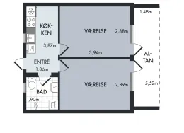 2 værelses på 52 m